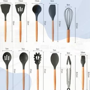 Apresentamos o Conjunto de Cozinha Premium de 12 Peças, uma escolha excepcional para chefs e entusiastas culinários. Com cabos de madeira ergonômicos e duráveis, este conjunto combina funcionalidade e elegância. Além disso, é livre de BPA e não tóxico e inodoro, proporcionando uma experiência culinária segura e saudável. Com sua capacidade de suportar temperaturas extremas de -40 a 230C, esses utensílios são perfeitos para qualquer preparação. Com o furo na ponta do cabo, é fácil pendurá-los e mantê-los organizados e acompanha um lindo baldinho caso preferir deixar todos juntos. Desfrute de um conjunto versátil, resistente e estiloso, que eleva suas habilidades culinárias e adiciona um toque de sofisticação à sua técnica:>Material: Silicone, Aço Inox e MDF>Livre de BPA>Peso aproximado na caixa: 1020kg>Peso aproximado sem caixa: 900g -- O que vem na caixa: 1- Colher Escumadeira 1- Espátula Sólida 1- Colher para Servir 1- Espátula Vazada 1- Colher Raspadora 1- Espátula Raspadora 1- Pegador de Macarrão 1- Concha de Sopa 1- Pincel Culinário 1- Pinça Pegador 1- Fouet Batedor 1- Baldinho Guardador
