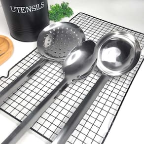 Colher, escumadeira e concha produzidas em aço inox. Projetado para um manuseio facil e eficaz, perfeito para uso em cozinha industrial, confeitaria, restaurante e buffet. Os utensilios de cozinha conta com um acabamento polido do aço inox, que adiciona um toque elegante, alem de ser facil de limpar.