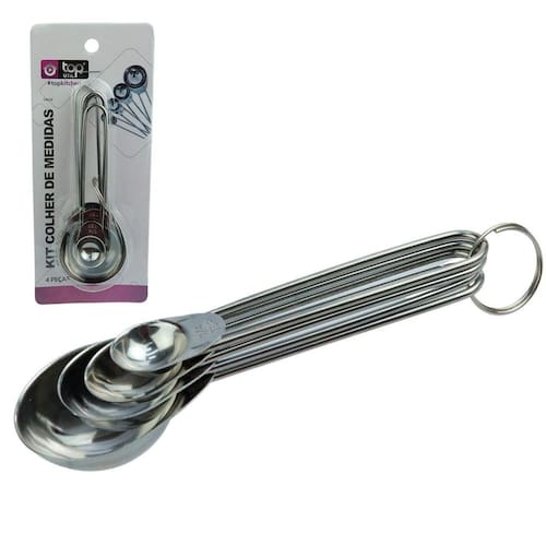 Colher Medidora Inox 1,25 a 15ml 4 Peças Colher Medidora Inox 1,25 a 15ml 4 peças. Medidas: 15ml - 5ml - 2,5ml - 1,25ml.\nEspecificações:\nMarca : D L FESTAS\nTipo de material : Inox\nCores ou Estampa : Prata\nDimensões do Produto : 12,5 X 4 X 2,5 CM\nDimensões da Embalagem : 18,5 X 7,5 X 3 CM\nPeso Bruto (Gramas) : 0.064 Marca: Não Informado