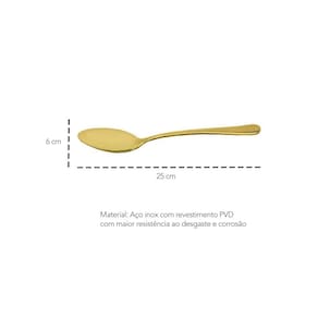Colher dourada ideal para arroz. Utensilios de cozinha da linha Lovers possui design em linhas ovaladas, acabamento acetinado que garante um design moderno, e combina com qualquer estilo. Produzido totalmente em aço inox de alta qualidade, com banho especial em PVD ((Physical Vapor Deposition), processo que produz vapor metalico de camada colorida e proporciona maior resistencia ao desgaste e corrosao, prolongando o periodo de vida util das peças. Esses talheres com certeza vao te surpreender. E podem ser lavados em maquinas de lava-louças e comparados a outros tipos de materiais, sao bem mais resistentes e duraveis.
