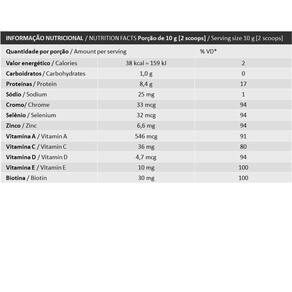 Colágeno hidrolisado, colágeno hidrolisado bioativo Verisol® , mix de vitaminas e minerais vitamina C ácido ascórbico , vitamina E DL alfa-acetato de tocoferol , zinco sulfato de zinco mono-hidratado , vitamina A acetato de retinol , cromo picolinato de cromo , selênio selenito de sódio , vitamina H biotina e vitamina D colecalciferol , acidulante ácido cítrico, aroma sintético idêntico ao natural e edulcorante estévia. NÃO CONTÉM GLÚTEN. contém aromatizante sintético idêntico ao natural.