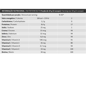 Colágeno hidrolisado, colágeno hidrolisado bioativo  Verisol® , mix de vitaminas e minerais vitamina C ácido ascórbico , vitamina E DL alfa-acetato de tocoferol , zinco sulfato de zinco mono-hidratado , vitamina A acetato de retinol , cromo picolinato de cromo , selênio selenito de sódio , vitamina H biotina e vitamina D  colecalciferol , acidulante ácido cítrico, aroma sintético idêntico ao natural e edulcorante estévia. NÃO CONTÉM GLÚTEN. contém aromatizante sintético idêntico ao natural.