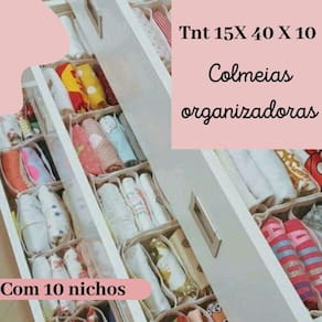 COLMEIA ORGANIZADORA DE GAVETAS KIT COM 10 UNIDADESOrganizadores de gavetas com 10 espaços cada colmeia.* Feitas com muito cuidado para deixar sua gaveta organizada. * Ideais par peças pequenas como Body para bebê cuecas, calcinhas, meias etc...* Kit com 10 unidades.* Feitos em TNT.*Feitos em PVC (Plástico Cristal)* Medidas: 15 x 40 x 10.