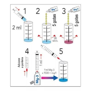 - 3 Reagentes 2 deles o frasco é conta gotas ; - 1 Seringa graduada 6 ml; - 1 Seringa graduada 1 ml + 1 ponteira para utilizar no frasco 3 ; - 1 Frasco para realização do teste; - 1 Manual de instruções.
