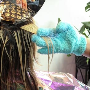 Luvas de malha projetadas para facilitar a mistura de cores. Deslize os dedos pelo cabelo processado enquanto estiver usando as luvas para obter um acabamento suavemente mesclado. As luvas coletam o excesso de descolorante, deixando o cabelo clareado com a quantidade certa de produto. Mantenha suas mãos livres de produtos e acelere o ritmo atrás da cadeira com The Blendies.