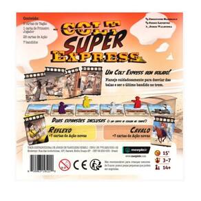Colt Super Express é um jogo de eliminação eletrizante. Você precisa planejar seus movimentos, desviar das balas e tentar não cair do trem. Ao final de cada rodada uma carta de vagão é retirada e se o seu bandido estava nela é fim de jogo para você. A edição brasileira de Colt Super Express inclui as expansões Reflexo e Cavalo, além de uma exclusiva carta promocional com o carro de viagem no tempo.