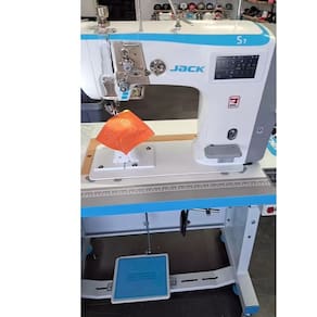 Máquina de costura de coluna de 1 agulha eletrônica com sistema de corte curto, motor de passo no transporte principal e no rodízio e levantador de calcador, ponto fixo, transporte triplo por rodízio, lançadeira normal, velocidade de 2.500RPM, altura do calcador de 15MM, tamanho do ponto até 7MM, com painel touchscreen, com mesa e estante com rodinhas.Funções