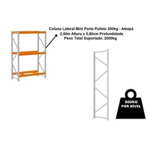 Lateral Para Mini Porta Pallet 500Kg 2,50m X 80cm Amapá A Coluna Lateral do Mini Porta Pallet de 500kg, dá sustentação do mini porta pallet e recebe o encaixe das longarinas em suas furações. A coluna lateral é composta por colunas, travessas diagonais e horizontais, sapatas, kit de parafusos e embalagem. todos os itens são reforçados para resistência e durabilidade. pintura do produto é feita por meio da técnica eletrostática, com tratamento anticorrosão uniforme e resistente deixando um acabamento de alto padrão.EspecificaçõesCor: CinzaMaterial: AçoMarca: AmapáPeso Total Suportado: 2000kgModelo: Coluna Lateral Mini Porta Pallet 500kgDimensões Altura: 2,50mProfundidade: 0,80m Contém 01 Coluna Lateral Para Mini Porta Pallet 500Kg 2,50m X 0,80cm - Amapá Entrega Via: TransportadoraPrazo: Consulte pelo CEP com nossos vendedores Garantia Contra Defeitos de Fabricação: 3 meses DevoluçãoEm até 7 dias após a chegada do produto, você tem o direito de realizar a devolução. Mas para isso, a mercadoria não deve ter sido montada, utilizada e danificada.Horário de AtendimentoSegunda a Sexta-feira, das 13:00h às 17:00h. Dúvida, Informações, Consulte Nossos Vendedores Via WhatsApp\nFicha Técnica\nCódigo AMP0659\nModelo Linha Mini Porta Pallet 500kg\nCategoria Acessórios\nMarca Amapá Metalúrgica\nItens Inclusos 01 Coluna Lateral Para Mini Porta Pallet 500Kg 2,50m X 0,80cm - Amapá\nGarantia 1 ano após o recebimento do produto\nDisponibilidade Disponível em 30 dias úteis Marca: Não Informado