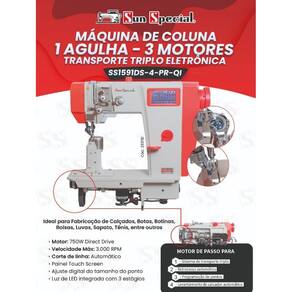 Máquina de costura industrial de coluna, transporte triplo, eletrônica. Possui 1 agulha, motor de passo para retrocesso e programação de pontos. Motor Direct Drive de 750W, velocidade máxima de 3.000 RPM. Levantamento e corte de calcador automáticos. Painel Touch Screen com ajuste digital do tamanho do ponto. Luz de LED integrada com 3 estágios. Funções automáticas incluem parada de agulha (em cima e/ou embaixo), controle de velocidade, corte de linha, levantador de calcador e posicionador de agulha. Ideal para fabricação de calçados, bolsas, luvas, entre outros.Funções