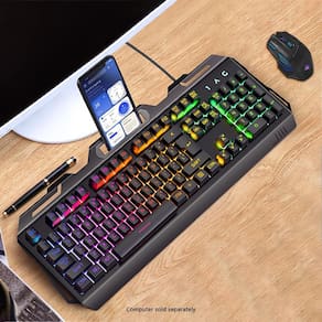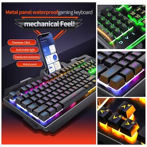 O teclado com fio RGB Gaming oferece precisão, durabilidade e estilo para jogadores e profissionais. Com um layout de 104 teclas em tamanho real com um toque mecânico, ele fornece teclas responsivas e controle suave para jogos de alta intensidade ou trabalho diário. Sua construção durável em painel de metal garante uso e estabilidade duradouros, enquanto a retroiluminação LED RGB com efeitos respiratórios adiciona uma experiência visual impressionante à sua configuração. O teclado inclui um suporte de telefone embutido, permitindo que você permaneça conectado ou realize várias tarefas sem esforço durante o jogo. Com anti-fantasma de várias teclas e um cabo trançado anti-interferência de 1,6 metros, o teclado garante um desempenho confiável e sem atrasos a cada pressionamento de tecla. É plug-and-play via USB, compatível com PC e laptop, tornando-o a escolha perfeita para jogadores que desejam desempenho e design em um único pacote.
