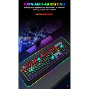 O teclado mecânico para jogos de 104 teclas em tamanho real criado para precisão, conforto e estilo. Com verdadeiros interruptores mecânicos e anti-fantasmas com várias teclas, ele garante uma resposta extremamente rápida para jogos competitivos. Com 20 modos de iluminação RGB dinâmicos e efeitos personalizáveis, este teclado dá vida à sua configuração com iluminação vibrante. O layout ergonômico das teclas e a construção durável proporcionam uma experiência de digitação confortável e confiável, enquanto as teclas de injeção dupla garantem legendas duradouras que nunca desaparecem. Projetado com proteção resistente a derramamentos, o T17 oferece tranquilidade contra respingos acidentais de líquidos. Basta conectar e usar via USB tipo A, sem necessidade de drivers.