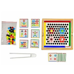 este jogo é indicado para todas as idades. Crianças menores podem se familiarizar com jogo, mas com a supervisão de um adulto, usando livremente o tabuleiro e a pinça. Embaralhe as fichas e comece a montar o tabuleiro a sequência da ficha escolhida. Auxilia no desenvolvimento da concentração, percepção de cores, coordenação motora fina e atenção. - marca: brinqmutti