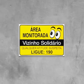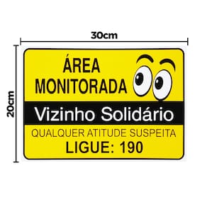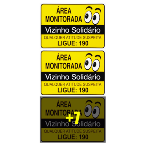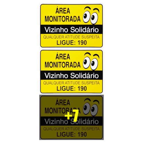Neste Kit contém 10 unidades de placas com a escrita "Área Monitorada Vizinho Solidário Qualquer Atitude Suspeita Ligue: 190".