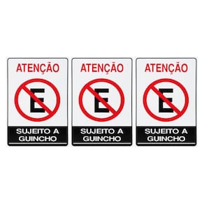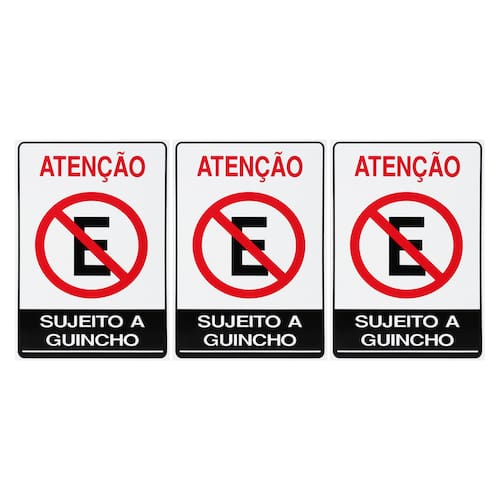 Neste Kit contém 3 unidades de placas com a escrita "Atenção Proibido Estacionar Sujeito A Guincho".
