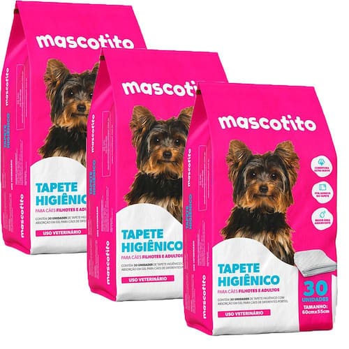 Combo 3 Tapetes Higiênicos Mascotito 60x55cm C/30 Unidades - Contém 3 Embalagens com 30 unidades cada, totalizando 90 unidades; - Indicado para cães; - Indicado para raças pequenas; - Alta tecnologia; - Tecnologia com extra gel; - Máxima proteção contra vazamentos; - Tamanho 60x55cm. O Tapete Higiênico Mascotito é indicado para cães de filhotes e adultos de pequeno porte. Ele possui uma alta tecnologia com extra gel, garantindo uma máxima proteção contra vazamentos. O tapete pode ser utilizado tanto em casa como em apartamentos. Desenvolvido com matérias de qualidade, resultando em um produto discreto, de fácil armazenamento proporcionando absorção na medida certa. Sua fabricação conta com 6 camadas de proteção e canais de absorção que garantem uma maior velocidade na absorção do xixi. Além disso conta com 4 fitas reposicionáveis. Modo de usar Tire o tapete da embalagem. Desdobre-o. Retire os papéis aplicados nos 4 cantos da parte inferior do tapete e fixe-o no chão com o lado dos adesivos voltados para baixo.