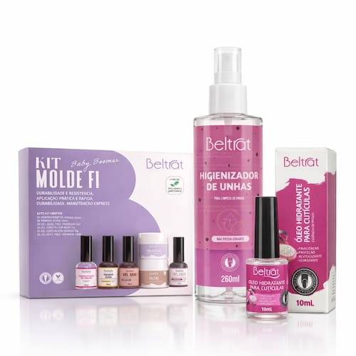 O Kit Baby Boomer Molde F1 Beltrat com Higienizador de Unhas e Óleo Hidratante para Cutículas é a combinação perfeita para quem busca preparação completa, durabilidade e acabamento profissional em procedimentos de unhas.