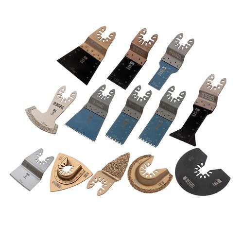 Inclui: • Lâmina Multifuncional Bimetálica 44 mm • Lâmina Abrasiva com Revestimento de Carboneto – 39 mm • Lâmina Segmentada 65 mm com Revestimento de Metal Duro • Lâmina Reta 80 mm em Aço Rápido • Lâmina Bimetálica 65 mm com Cobalto • Lâmina de Corte 34 mm em Aço Carbono • Lâmina de Corte 34x1,4 mm em Aço Carbono • Lâmina de Corte 20 mm em Aço Carbono • Lâmina Bimetálica 65 mm com Cobalto (unidade extra) • Lâmina de Corte 33 mm em Aço Carbono • Lâmina Bimetálica 44 mm com Cobalto • Lâmina Segmentada Diamantada de 60 mm • Lâmina Semicircular de 32 mm em Aço Inoxidável