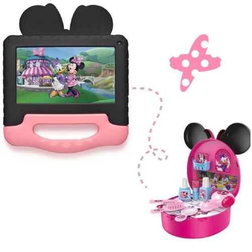 Conteúdo do combo: Tablet Multi Minnie com Controle Parental 7 pol 4GB RAM 64GB Android 13 Wi- fi + Case - NB414 + Maleta com Alça Minnie Cabeleireira Com Acessórios Multikids - BR1560