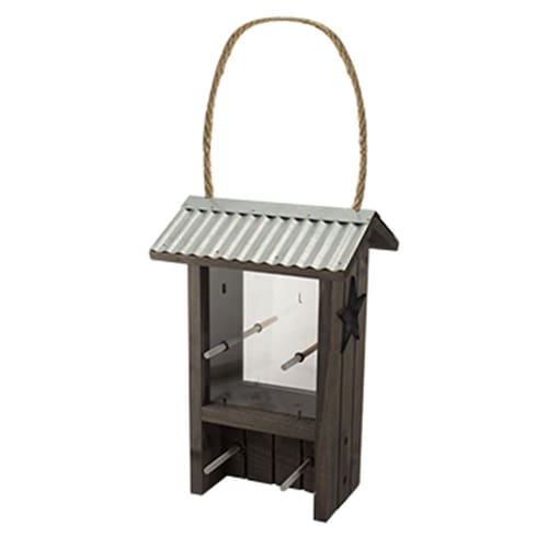 Comedero rústico estilo rancho para pájaros, con techo de metal galvanizado y decoración lateral en forma de estrella metálica. Puede sostener hasta 1,25 libras de semillas, soportando múltiples aves a la vez. Mide 15,24 cm de largo, 18,42 cm de ancho y 27,94 cm de alto, ideal para tu jardín. Se cuelga fácilmente con la cuerda de yute incluida, perfecta para que los pinzones se posen y se alimenten en ambos lados. Versátil para colocar en tu patio trasero: puede ser montado o colgado según lo necesites.