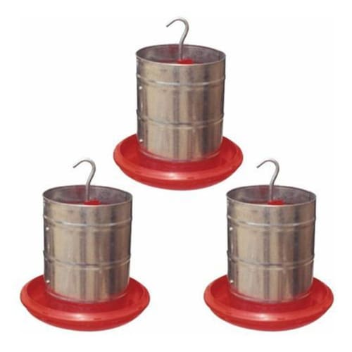 Comedouro Aves Galvanizado Prato Plástico 3kg 3 Unidades Conhecido como comedouro suspenso, Utilizado por sitiantes em aviários, tubo galvanizado, base prato plástico vermelho. Características: Volume 3kg de ração. Possui regulagem na travessa superior em conjunto com a haste; O prato com 26 x 26 Cm é injetado com material 100% puro virgem PP H 103 com 0,02% UV contra raios ultravioletas; Altura Total 19 Cm; Fácil acesso das aves ao alimento; Peso: 320g. Conteúdo da embalagem: 3 Comedouros com capacidade para 3kg de ração cada.