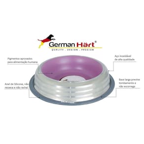 O comedouro em inox da Germanhart é super resistente e durável! O anel de silicone não resseca e não racha! A base larga previne tombamentos e não escorrega. Além disso, os pigmentos são seguros!