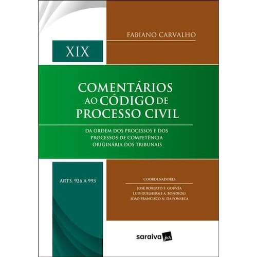 ´Comentários ao Código de Processo Civil´ constitui-se em uma coleção que analisa os 1.072 artigos do CPC de 2015. Cada volume foi elaborado por professores reconhecidos no mercado pela qualidade das pesquisas e contribuições acadêmicas. As obras destacam-se pela densidade nos estudos, unindo a teoria doutrinária e a prática processual na solução dos problemas a serem enfrentados pelos acadêmicos e profissionais do direito. No volume XIX, o autor Fabiano Carvalho analisa os arts. 926 a 993 do CPC, tratando da ordem dos processos e dos processos de competência originária dos tribunais, abrangendo temas como meios de impugnação; incidente de assunção de competência; incidente de arguição de inconstitucionalidade; conflito de competência; homologação de decisão estrangeira; concessão do exequatur à carta rogatória; ação rescisória; incidente de resolução de demandas repetitivas e reclamação. Data de fechamento da edição: 15-12-2021.