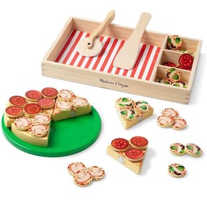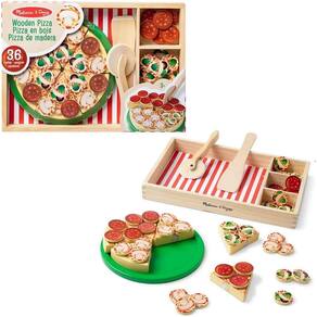 Seis fatias de pizza de madeira e 36 coberturas de madeira para brincar, abas autoadesivas mantêm as peças juntas e depois separam .Inclui separador de pizza, espátula e bandeja de servir Armazenada ordenadamente em uma caixa de madeira. É um ótimo presente para meninas e meninos, de 3 a 6 anos, para atividades práticas.