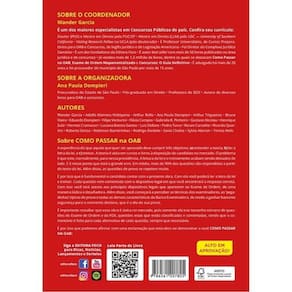 Sobre a importância do Livro para o Exame Unificado O presente livro traz solução completa em matéria de preparação para o Exame da OAB por meio de resolução de questões, trazem todas as questões do Exame Unificado, e ainda uma bateria de questões extras de outros exames da FGV e OAB não unificado. Assim, o examinando estuda pelo estilo de questões do Exame de Ordem e também pelo estilo de questões da FGV. Entender os dois estilos é muito importante, pois cada tipo de exame (no caso, o Exame de Ordem) e cada banca examinadora (no caso, a FGV) têm características próprias em relação aos seguintes aspectos: a) maneira de apresentar as perguntas, b) técnicas utilizadas para dificultar a resolução das questões, c) teses jurídicas preferidas, d) tipo de doutrina utilizada e e) temas preferidos, recorrentes e reputados mais importantes. E essa identidade é bem acentuada em se tratando das questões típicas de Exame de Ordem e do estilo de questões da Fundação Getúlio Vargas/FGV. É por isso que a obra é indispensável para você que deseja ser aprovado no Novo Exame de Ordem. A partir da resolução de todas as questões existentes no livro, você entrará em contato com o jeito, as técnicas, as teses jurídicas, a doutrina e os temas preferidos e recorrentes do Exame de Ordem e da nova examinadora, o que, certamente, será decisivo para a sua aprovação.