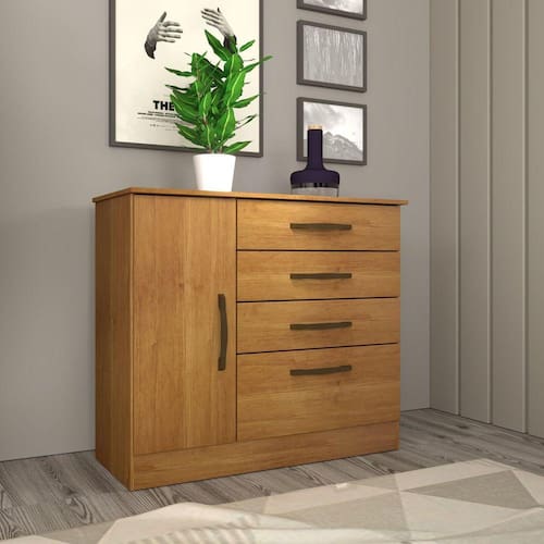 A Cômoda Chicago é um produto fabricado com material MDP, conta com 4 gavetas, corrediças telescópicas, sapateira lateral com prateleira, puxadores em PVC, modelo perfil H, excelente acabamento em filete e pintura UV. Acabamento da Gaveta: Pintura Acabamento da Porta: Pintura Acabamento da Prateleira: Pintura Ambiente Principal: Quarto Complexidade da Montagem: Baixa: pode ser montado por uma pessoa sozinha Cor: Cinamomo Cor do Produto: Cinamomo Escala de Brilho: Semi-Brilho Escala de Brilho da Gaveta: Semi-Brilho Escala de Brilho da Porta: Semi-Brilho Escala de Brilho da Prateleira: Semi-Brilho Gaveta com Chave: Não Informações Complementares: Gaveta com chave possui divisórias de gaveta biju para joias. Itens Inclusos: 1 Cômoda, Kit Ferragens e Manual de Montagem. Linha ou Coleção: Chicago Manual de Montagem e Instalação: https://cdn2.madeiramadeira.com.br/atributo/tcil-moveis/615878-manual-de-montagem-c-moda-4-gav-chicago.pdf Material da Gaveta: MDP Material da Porta: MDP Material da Prateleira: MDP Material do Fundo: MDP Material do Puxador da Gaveta: PVC Material do Puxador da Porta: PVC Material Principal: MDP Necessita Montagem: Sim Origem do Produto: Nacional Peso: 34,56 kg Peso Máximo por Gaveta: 5 kg Peso Máximo por Prateleira: 5 kg Possui Espelho: Não Possui Nichos: Não Possui Pés: Não Possui Portas: 01 Possui Prateleiras: 01 Recomendações de Uso, Manutenção e Limpeza: Não colocar o produto em lugar úmido, não arrastar, limpar somente com pano macio e seco, não expor o produto a incidência de luz solar, não colocar peso superior ao indicado. Sapatas Niveladoras: Não Sistema de Montagem: Parafuso, cavilha e pregos. Suporta Até (kg): 30 kg Tipo de Corrediça da Gaveta: Metálica Telescópica Tipo de Dobradiça/Corrediça da Porta: Metálica Tipo de Porta: Bater Tipo de Puxador da Gaveta: Externo Tipo de Puxador da Porta: Externo