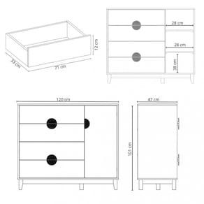 Características: 1 Porta 4 Gavetas Corrediças telescópicas Estrutura em MDP Pés em madeira Puxadores de ABS com acabamento metalizado Porta com dobradiças Slow Motion
