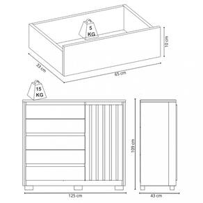 Características: 1 Porta com acabamento ripado 2 Prateleiras 5 Gavetas Corrediças telescópicas Dobradiça Slow Motion Estrutura em MDP Gavetas suportam 5 kg Possui kit anti-tombamento Possui pés Tampo e molduras de 25 mm Tampo superior suporta 15 kg