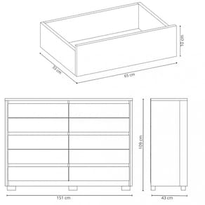 Características: 10 Gavetas 6 Pés Corrediças telescópicas Estrutura em MDP Gavetas suportam 5 kg Possui kit anti-tombamento Tampo e molduras de 25 mm Tampo superior suporta 15 kg