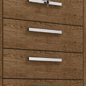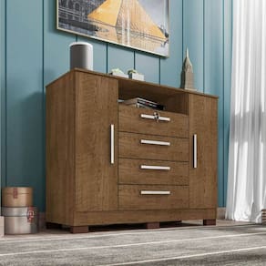 Destacando-se pela praticidade, a cômoda possui seis puxadores cromados e dobradiças metálicas que garantem durabilidade e facilidade no uso diário. Além disso, o produto é ecologicamente correto, produzido com materiais provenientes de reflorestamento e conta com um sistema de montagem simples, facilitando sua instalação.