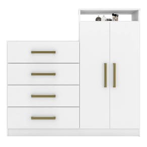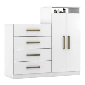 Uma cômoda elegante que complementa o ambiente e oferece muita praticidade. Com quatro gavetas espaçosa e um armário de duas portas com duas prateleiras interna, espaço para acomodação de roupas e objetos não será um problema. Ainda conta com um nicho na parte superior para itens menores ou objetos de decoração. Com puxadores na cor bronze, sua fabricação é feita em MDP de alto padrão, com acabamento resistente, proporcionado por sua pintura UV. Para garantir a qualidade do produto dentro da embalagem, as caixas são revestidas por um plástico termoencolhível e todas as peças são separadas por isomanta, tudo para preservar e evitar o atrito entre as peças dentro da embalagem. Você contará também com um manual com o passo a passo para auxiliar no momento da sua montagem.