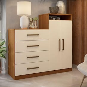 Comoda 2 Portas 4 Gavetas Nora Amendola Off-white Essa cômoda é perfeita para quem procura complementar o ambiente com elegância e praticidade. Ela conta com quatro gavetas espaçosas e um armário de duas portas, com duas prateleiras internas, com essa cômoda, espaço não é um problema! Ainda conta com um nicho na parte superior, para itens menores ou objetos de decoração Produto fabricado em MDP e conta com puxadores em plástico na cor bronze