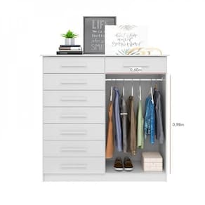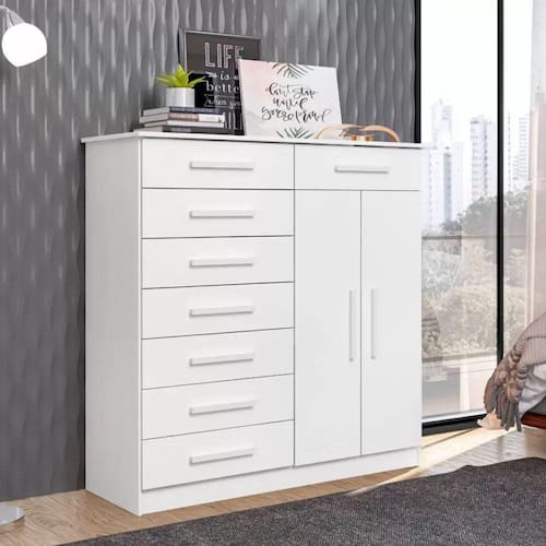 A Cômoda New Verona é um produto ideal para otimizar o espaço, pois é compacta. O produto tem oito gavetas e duas portas com cabideiro, para auxiliar na organização de roupas e Acessórios.