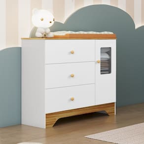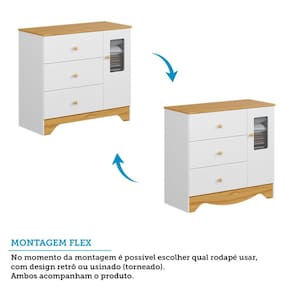 A Cômoda Infantil Ben é uma solução moderna para montar o quarto de bebê com estratégias inteligentes, qualidade e o melhor custo-benefício. É um produto em MDF e acabamento em pintura atóxica. Possui 1 porta com janela com vidro que permite visualizar o interior do móvel 1 prateleira e 3 gavetas com corrediças telescópicas. O produto possui um diferencia na montagem com diuas opções de rodapé para escolha no momento da montagem.