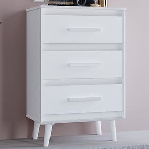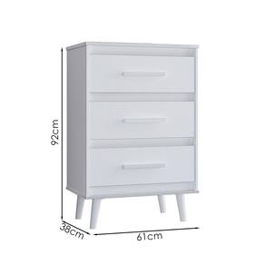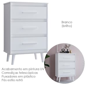 Cômoda Mila, ideal para compor quartos com modernidade e elegância. Produzida em MDP (12/15mm) com acabamento em pintura UV. Conta com 03 gavetas com corrediças telescópicas, puxadores em plástico e pés estilo retrô. Este produto será entregue em 01 volume.