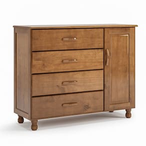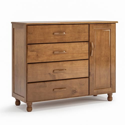 A Cômoda 4 Gavetas 1 Porta 100% Madeira Rústica Ariel é a escolha perfeita para quem busca um móvel robusto, funcional e com presença marcante no ambiente. Produzida com madeira de Pinus de reflorestamento, ela combina resistência e consciência ambiental. Seu acabamento em pintura UV valoriza os veios naturais da madeira, enquanto os pés maciços torneados trazem um toque de charme e sofisticação ao estilo rústico. As quatro gavetas com corrediças metálicas oferecem ótimo espaço para organização, e a porta lateral com dobradiça de pressão garante ainda mais praticidade no uso. Os puxadores em madeira complementam o visual artesanal e acolhedor, tornando essa cômoda uma excelente opção para quem deseja aliar durabilidade e elegância no quarto.