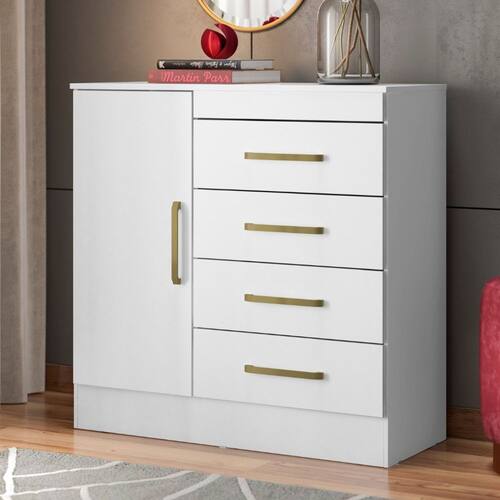 Características: 1 Porta 4 Gavetas Estrutura em MDP 15mm e 12mm Acabamento UV Corrediças metálicas