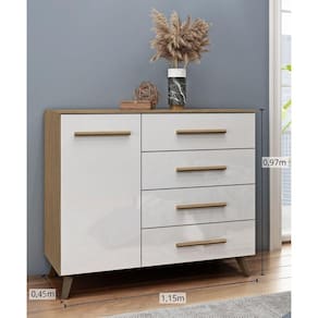 Esta é a Cômoda Verona, robusta e cheia de charme. Produzida 100% em painel 15mm de espessura, possui gavetas com corrediças telescópicas, puxadores em MDF que dão um charme ao produto. Trazendo um ar retrô, a Cômoda Verona possuí 5 pés em ABS. Sua divisão central é excelente, conta com 2 prateleiras na sapateira. Acabamento da Gaveta: Pintura UV Acabamento da Porta: Pintura UV Acabamento da Prateleira: Pintura UV Ambiente Principal: Quarto Complexidade da Montagem: Baixa: pode ser montado por uma pessoa sozinha Cor: Nogueira/Branco Cor do Produto: Nogueira/Branco Escala de Brilho: Alto Brilho e Fosco Escala de Brilho da Gaveta: Brilhante Escala de Brilho da Porta: Brilhante Escala de Brilho da Prateleira: Fosco Gaveta com Chave: Não Itens Inclusos: 1 Cômoda, Kit Ferragens e Manual de Montagem Manual de Montagem e Instalação: https://cdn2.madeiramadeira.com.br/atributo/mapi-moveis/1049745-cOmoda-verona-ref-505.pdf Material da Gaveta: MDP Material da Porta: MDP Material da Prateleira: MDP Material do Fundo: HDF 2,5mm Material do Puxador da Gaveta: MDF Material do Puxador da Porta: MDF Material dos Pés: ABS Material Principal: MDP Necessita Montagem: Sim Origem do Produto: Nacional Pés Reguláveis: Não Peso: 46,5 kg Peso Máximo por Gaveta: 5 kg Peso Máximo por Prateleira: 5 kg Possui Espelho: Não Possui Nichos: Não Possui Pés: 05 Possui Portas: 01 Possui Prateleiras: 02 Possui Rodízio: Não Recomendações de Uso, Manutenção e Limpeza: Não colocar o produto em lugar úmido, não arrastar, limpar somente com pano macio e seco, não expor o produto a incidência de luz solar, não colocar peso superior ao indicado. Sapatas Niveladoras: Não Sistema de Montagem: Parafusos, Cavilhas e Porca Cilindrica Suporta Até (kg): 50 kg Tipo de Corrediça da Gaveta: Metálica Telescópica Tipo de Dobradiça/Corrediça da Porta: Alumínio Tipo de Porta: Bater Tipo de Puxador da Gaveta: Externo Tipo de Puxador da Porta: Externo