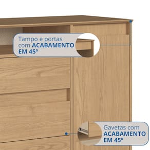 Com acabamentos em 45º em seu tampo, portas e gavetas, a Cômoda Alba traz personalidade e estilo ao seu espaço. Ela possui quatro gavetas com corrediças telescópicas, que garantem maior estabilidade na abertura e além de duas portas que oferecem mais espaço de armazenamento. As gavetas e portas contam com puxadores invisíveis, proporcionando uma integração harmoniosa com o ambiente.