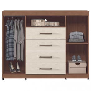 Além de oferecer um espaço generoso, esta cômoda impressiona com seu design prático e funcional. Com duas portas distintas: uma porta equipada com cabideiro em alumínio, ideal para pendurar calças, camisas, camisetas e muito mais; enquanto a outra porta conta com prateleiras para guardar sapatos, caixas, decorações e outros objetos essenciais do seu dia a dia. Suas quatro amplas gavetas deslizam suavemente sobre corrediças metálicas, garantindo um armazenamento organizado e de fácil acesso para suas roupas.