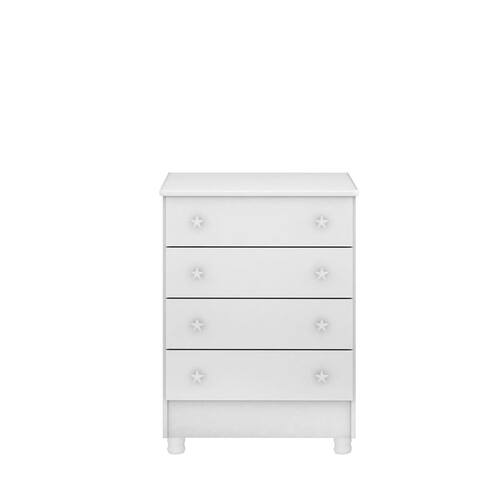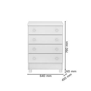 A Cômoda Encanto Feliz oferece praticidade e encanto para o seu ambiente. Com quatro gavetas espaçosas, proporciona amplo espaço de armazenamento para suas roupas e acessórios. As gavetas contam com corrediças metálicas de qualidade, garantindo um deslizamento suave e eficiente.