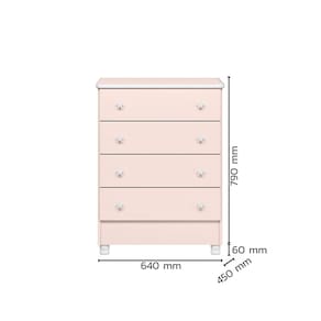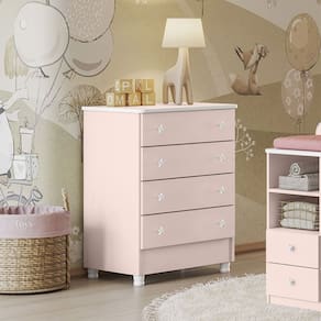 A Cômoda Encanto Feliz oferece praticidade e encanto para o seu ambiente. Com quatro gavetas espaçosas, proporciona amplo espaço de armazenamento para suas roupas e acessórios. As gavetas contam com corrediças metálicas de qualidade, garantindo um deslizamento suave e eficiente.