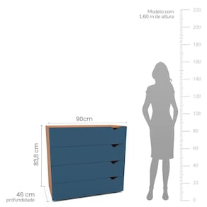 A cômoda 4 gavetas Porto, da Politorno Móveis, é a escolha perfeita para quem busca um design moderno, elegante e sofisticado. Produzida em MDP/MDF, possui acabamento em pintura UV e FF, garantindo alta resistência e durabilidade. Seus puxadores embutidos conferem um visual clean e sofisticado, enquanto as corrediças telescópicas proporcionam um deslizamento suave e preciso das gavetas. Com 83,8 cm de altura, 90 cm de largura e 46 cm de profundidade, oferece um espaço funcional para organizar roupas e objetos, sendo ideal para quartos e closets. De alta qualidade, essa cômoda une praticidade e beleza para um ambiente mais organizado e aconchegante. Produto Montado: Sim Acabamento da Gaveta: Pintura UV Acabamento dos Pés: Poliéster Altura dos Pés: 0,37 cm Altura Máxima dos Pés: 0.3700 Ambiente Principal: Quarto codigo_ean: 7900288108920 Complexidade da Montagem: Média: pode ser montado por mais de uma pessoa e/ou necessite de maior conhecimento para montagem Cor: Freijó/Azul Cor do Produto: Freijó/Azul Cor Interna: Freijó Escala de Brilho: Semi-Fosco Escala de Brilho da Gaveta: Semi-Fosco Gaveta com Chave: Não Itens Inclusos: 1 Cômoda, Kit Ferragens e Manual de Montagem Linha ou Coleção: Porto Manual de Montagem e Instalação: https://product-hub-prd.madeiramadeira.com.br/983953/documents/18e07dea-8776-407b-852b-e2e2925417232781394622417436276160987.pdf Marca: Politorno Material da Gaveta: MDF/MDP Material do Fundo: MDF/MDP Material dos Pés: Plástico Material Principal: MDF/MDP Necessita Montagem: Sim Origem do Produto: Nacional Pés Reguláveis: Não Peso: 20,95 kg Peso Máximo por Gaveta: 5 kg Possui Espelho: Não Possui Nichos: Não Possui Pés: 04 Possui Portas: Não Possui Prateleiras: Não Possui Rodízio: Não Quantidade de Gavetas: 04 Gavetas Recomendações de Uso, Manutenção e Limpeza: Utilize um pano macio umedecido com água e sabão neutro, seguido de pano seco. Não utilize produtos químicos ou abrasivos para limpeza, pois estes danificam o revestimento do móvel. Sapatas Niveladoras: Sim Sistema de Montagem: Cavilha, Parafuso, Minifix e prego Suporta Até (kg): 10 kg Tipo de Cômoda: Adulto Tipo de Corrediça da Gaveta: Metálica Telescópica Tipo de Puxador da Gaveta: Embutido undefined: 983956