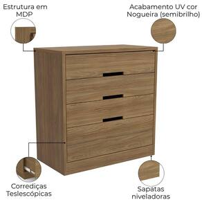 Cômoda S824, solução funcional com design inteligente. Estrutura em MDP (15mm) com acabamento em pintura UV. Acompanha sapatas niveladoras e 4 gavetas usinadas (sendo 1 gavetão) equipadas com corrediças telescópicas, para maior facilidade no dia a dia. Este produto será entregue em 01 volume.