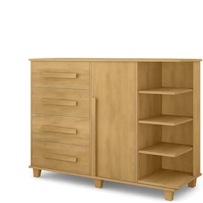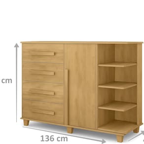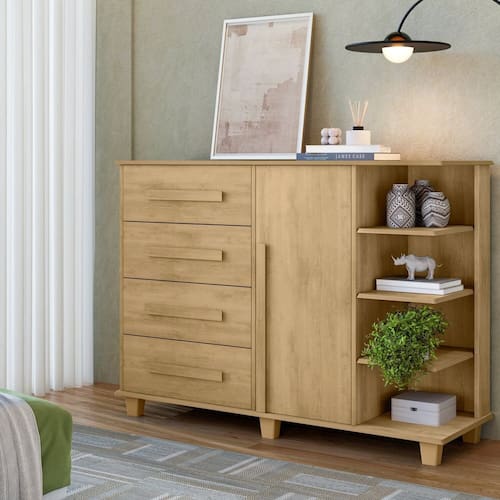 São 4 gavetas espaçosas, uma porta com prateleira interna e nichos laterais abertos que dão um charme extra ao móvel — ideais para organizar desde roupas e acessórios até objetos decorativos.