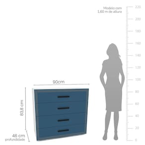 A cômoda 4 portas Valência, da Politorno Móveis, combina elegância, sofisticação e funcionalidade. Com 83,8 cm de altura, 90 cm de largura e 46 cm de profundidade, oferece excelente espaço para organizar roupas e acessórios de forma prática. Fabricada em MDP/MDF, com acabamento em pintura UV e FF, garante alta durabilidade e resistência. O design sofisticado é complementado pelos detalhes usinados, que conferem um toque refinado, e pelos puxadores externos, que facilitam o manuseio. Além disso, as gavetas contam com corrediças telescópicas, proporcionando um deslizamento suave e preciso. Ideal para quem busca qualidade e organização no ambiente. Produto Montado: Sim Acabamento da Gaveta: Pintura UV Acabamento dos Pés: Polipropileno Altura dos Pés: 0,37 cm Altura Máxima dos Pés: 0.3700 Ambiente Principal: Quarto codigo_ean: 7900288112811 Complexidade da Montagem: Média: pode ser montado por mais de uma pessoa e/ou necessite de maior conhecimento para montagem Cor: Branco/Azul Cor do Produto: Branco/Azul Cor do Puxador: Preto Cor Interna: Branca Escala de Brilho: Semi-Fosco Escala de Brilho da Gaveta: Semi-Fosco Gaveta com Chave: Não Itens Inclusos: 1 Cômoda, Kit de Ferragens e Manual de Montagem. Linha ou Coleção: Valência Manual de Especificação Técnica: https://product-hub-prd.madeiramadeira.com.br/984500/documents/96265fc8-b26f-4961-bf50-79ca074602d62804314622417440329010667.pdf Manual de Montagem e Instalação: https://product-hub-prd.madeiramadeira.com.br/984500/documents/82f3ad39-929b-4386-893d-df8752b70a482804313622417440328989812.pdf Marca: Politorno Material da Gaveta: MDF/MDP Material do Fundo: MDF/MDP Material do Puxador da Gaveta: MDF Material dos Pés: Plástico Material Principal: MDF/MDP Necessita Montagem: Sim Origem do Produto: Nacional Pés Reguláveis: Não Peso: 24,59 kg Peso Máximo por Gaveta: 5 kg Possui Espelho: Não Possui Nichos: Não Possui Pés: 04 Possui Portas: Não Possui Prateleiras: Não Possui Rodízio: Não Quantidade de Gavetas: 04 Gavetas Recomendações de Uso, Manutenção e Limpeza: Utilize um pano macio umedecido com água e sabão neutro, seguido de pano seco. Não utilize produtos químicos ou abrasivos para limpeza, pois estes danificam o revestimento do móvel. Sapatas Niveladoras: Sim Sistema de Montagem: Cavilha, Parafuso, Minifix e prego Suporta Até (kg): 10 kg Tipo de Cômoda: Adulto Tipo de Corrediça da Gaveta: Metálica Telescópica Tipo de Puxador da Gaveta: Externo undefined: 984507