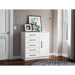 A Cômoda 5 Gavetas 1 Porta Milão Aramóveis, fabricada em MDP 15mm e 12mm de espessura. Seu espaçoso interior proporciona estabilidade ao móvel, enquanto os puxadores de plástico conferem resistência. Equipada com dobradiças metálicas, a cômoda oferece maior facilidade ao abrir e fechar as portas. O acabamento em verniz de alto brilho não apenas conserva o móvel, mas também proporciona uma estética contínua, garantindo beleza, resistência e prolongando a vida útil do produto.